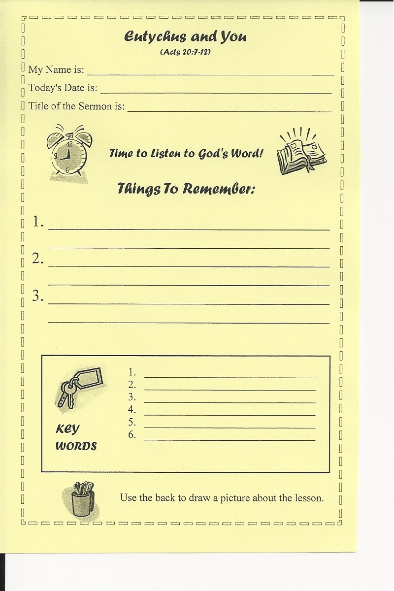 A long, long time ago, my brother-in-law, Stan Mitchell, was looking for a way to remind the kids in his congregation that it was important for them to listen to sermons, even if they couldn’t understand everything that was being said. It’s a matter of discipline, you see, training them to develop the habit of listening while that training is easier. He began making available a little handout sheet that he titled “Eutychus and You,” and asked the younger set in his audience to listen enough to write down a few important words, maybe a key point or two, maybe even list the scripture references from the sermon. After the worship service, they could bring their notes to “Mr. Mitchell.” During the afternoon, he would “critique” them (very positively, no doubt), and then attach a piece of chewing gum to the paper, all of which would be returned to the youngster before the evening service.